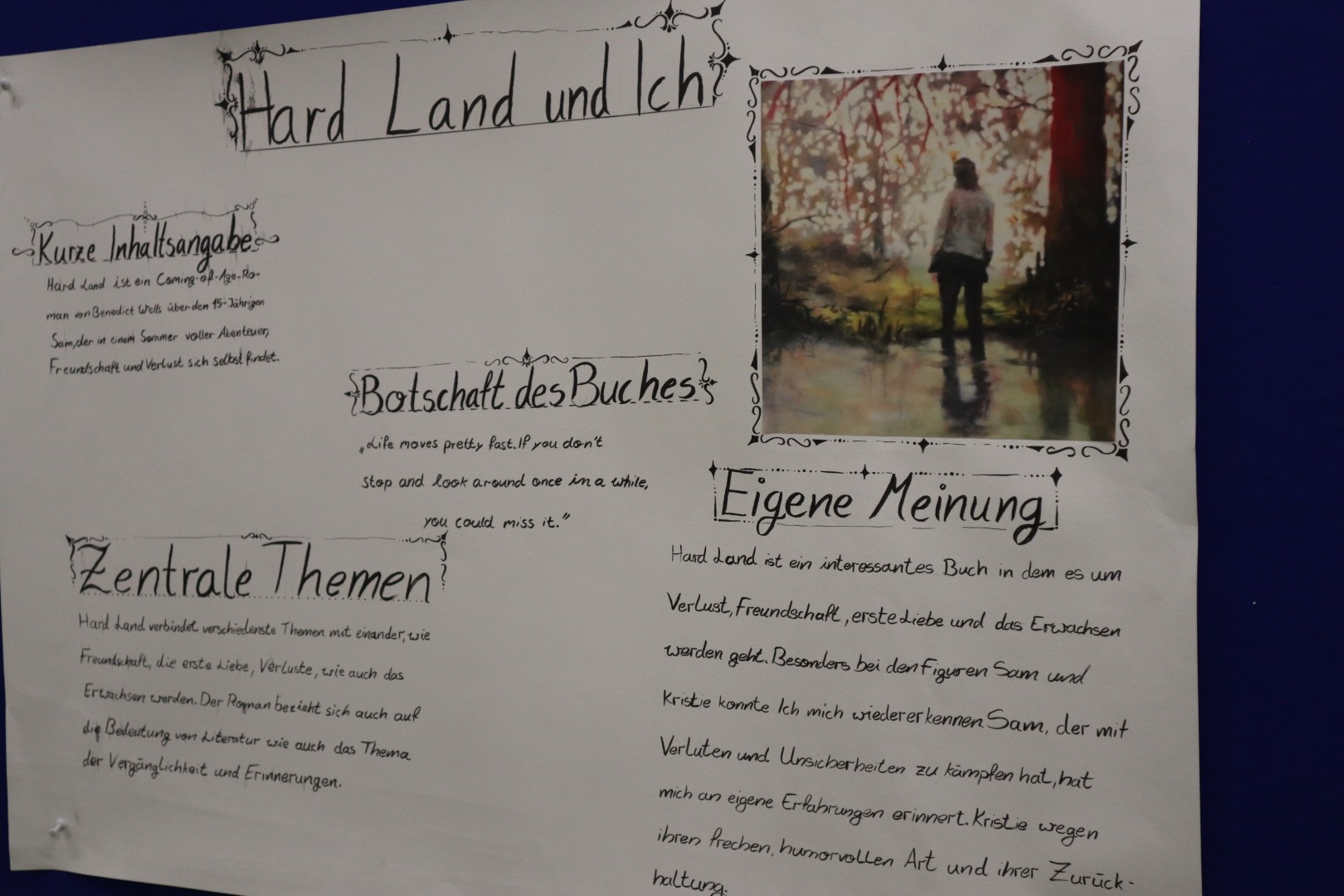 Am Donnerstagabend gestalteten die Schüler:innen der Klassenstufe 10 eine Ausstellung zur aktuellen Lektüre "Hard Land" von Benedict Wells im Fach Deutsch.