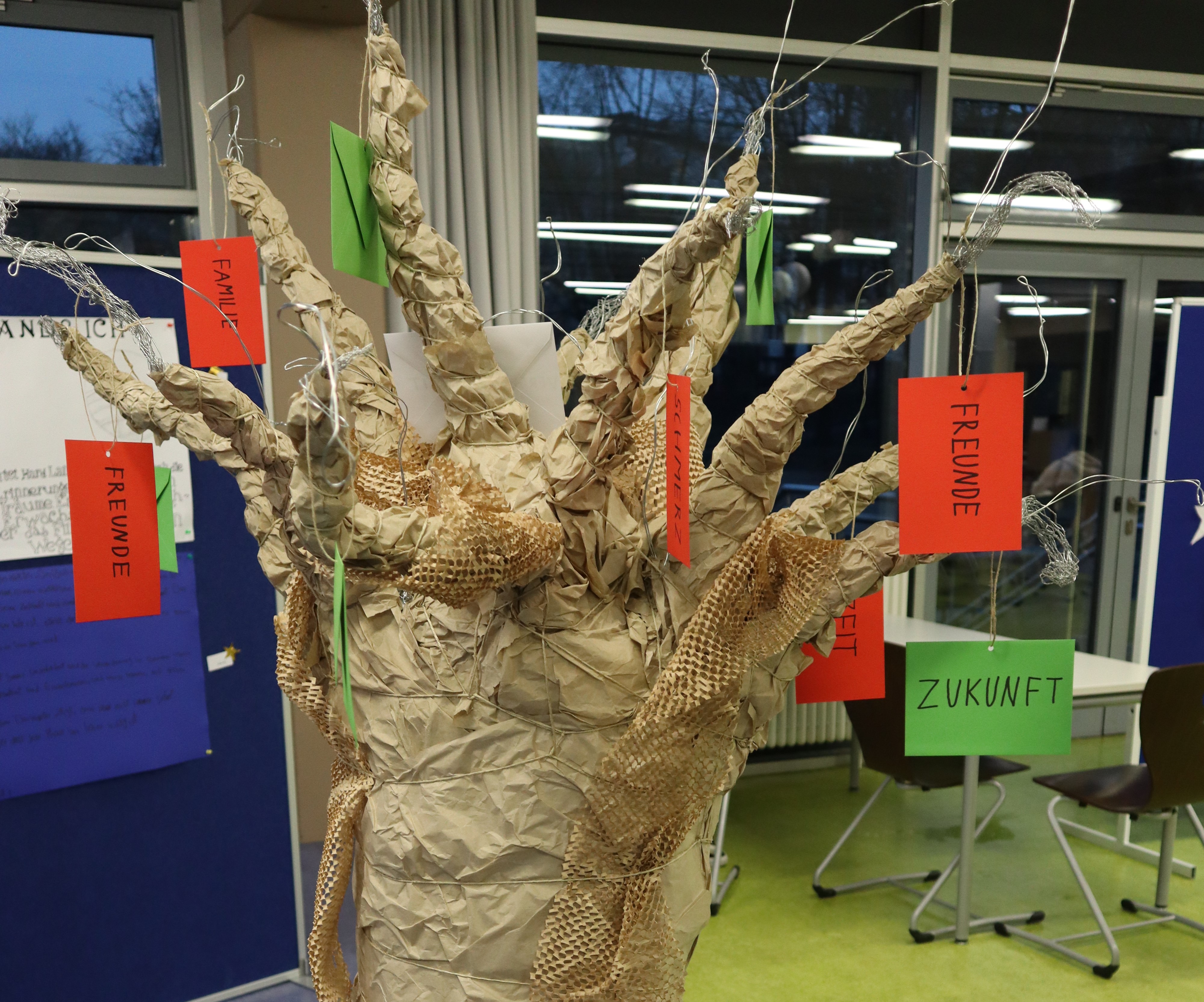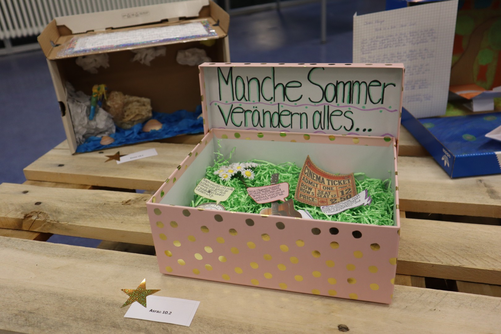Ganz individuell präsentierten die Schüler:innen Skulpturen, großformatige Bilder, Plakate und Book in a Box Ausführungen. Ein Highlight waren ebenso selbst geschriebene Gedichte in deutscher und englischer Sprache, die beim Zuhören für Gänsehaut im Publikum sorgten.