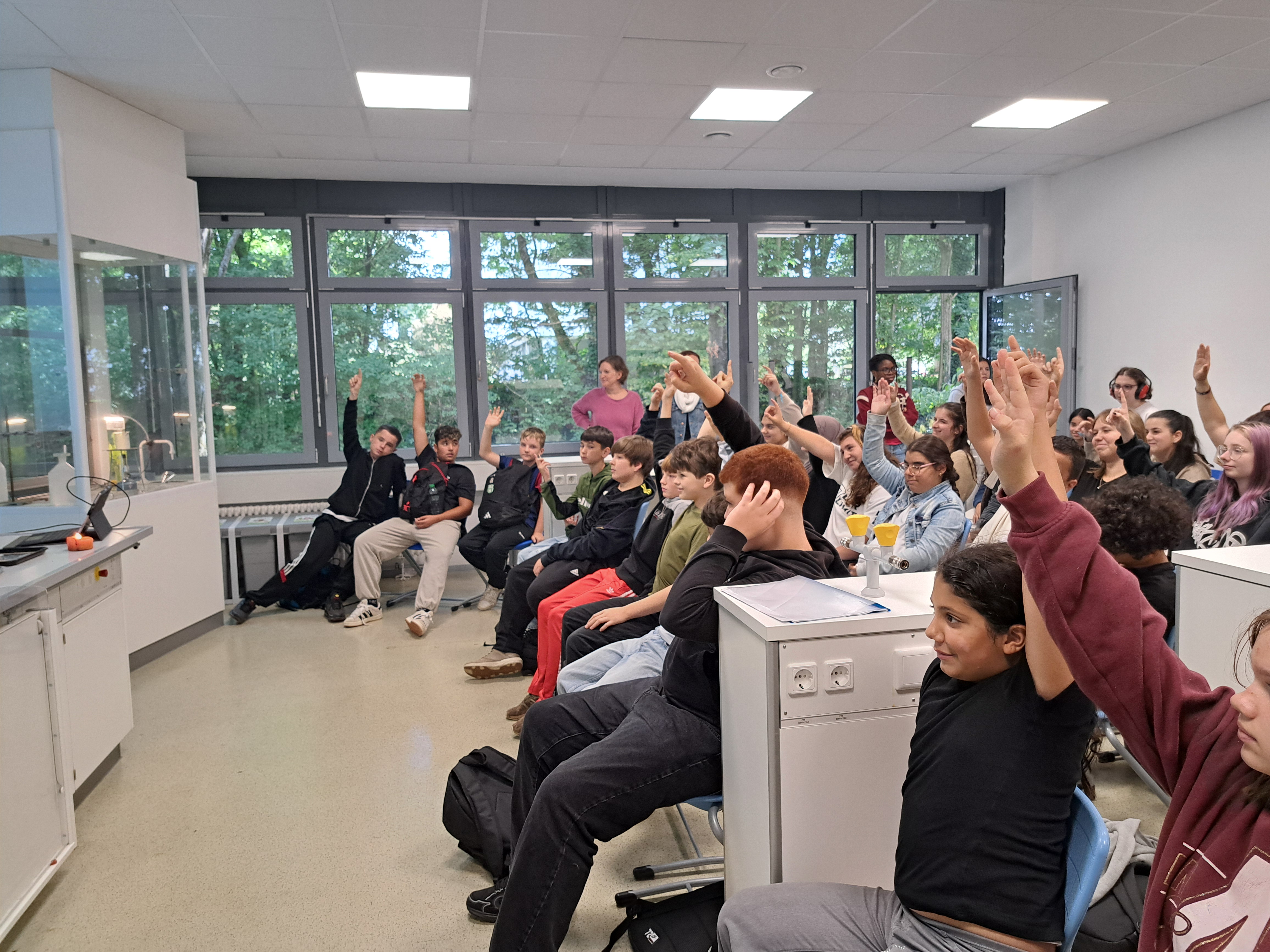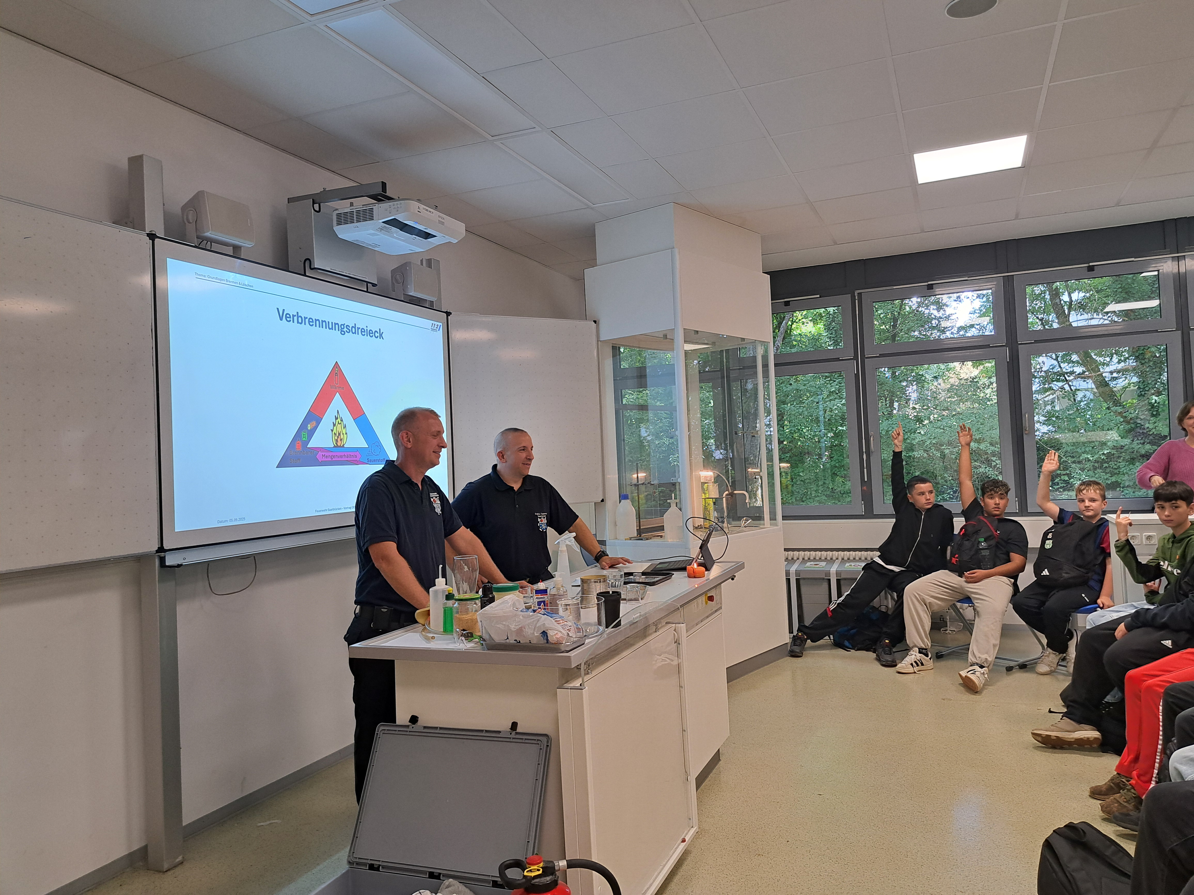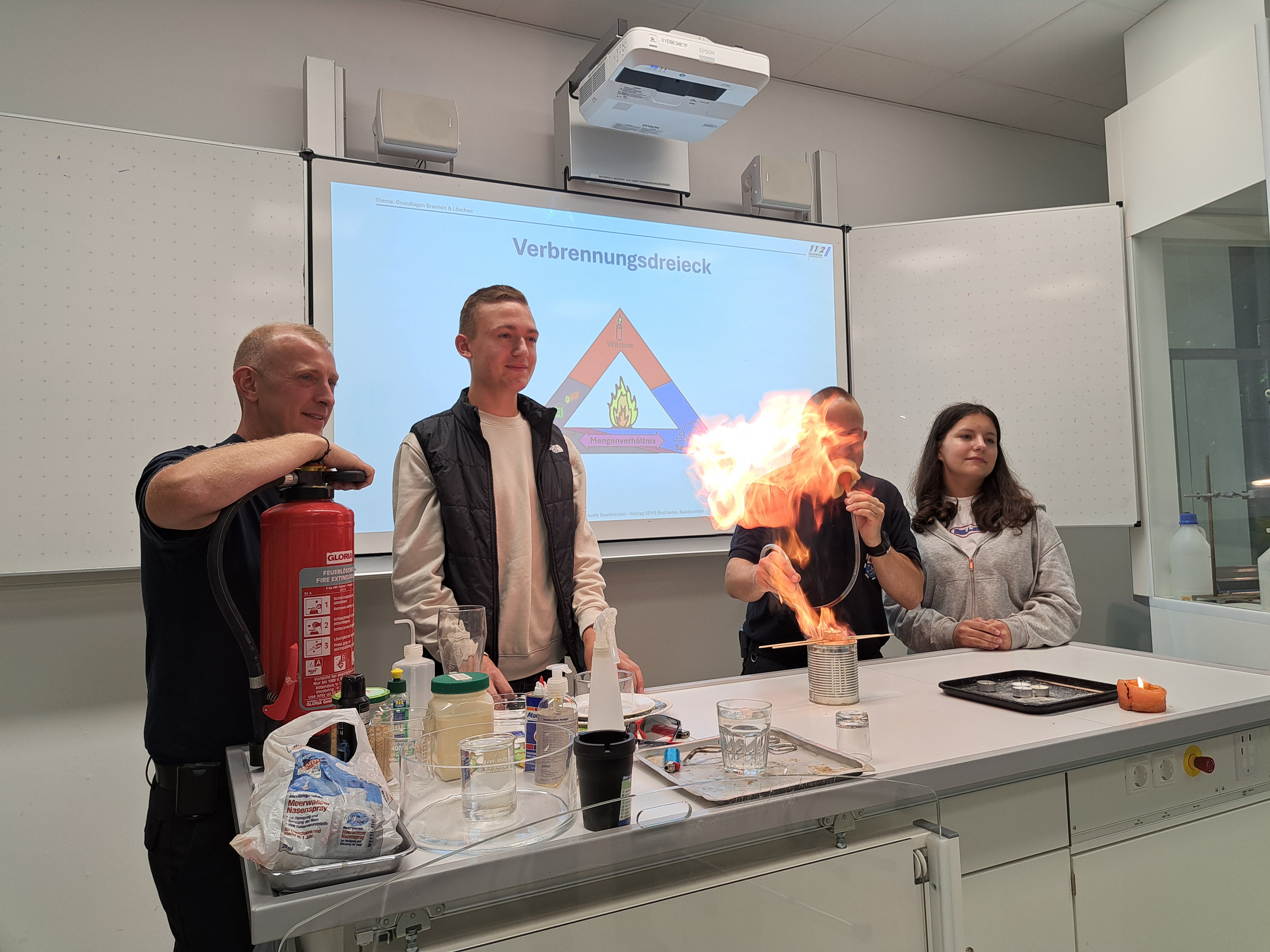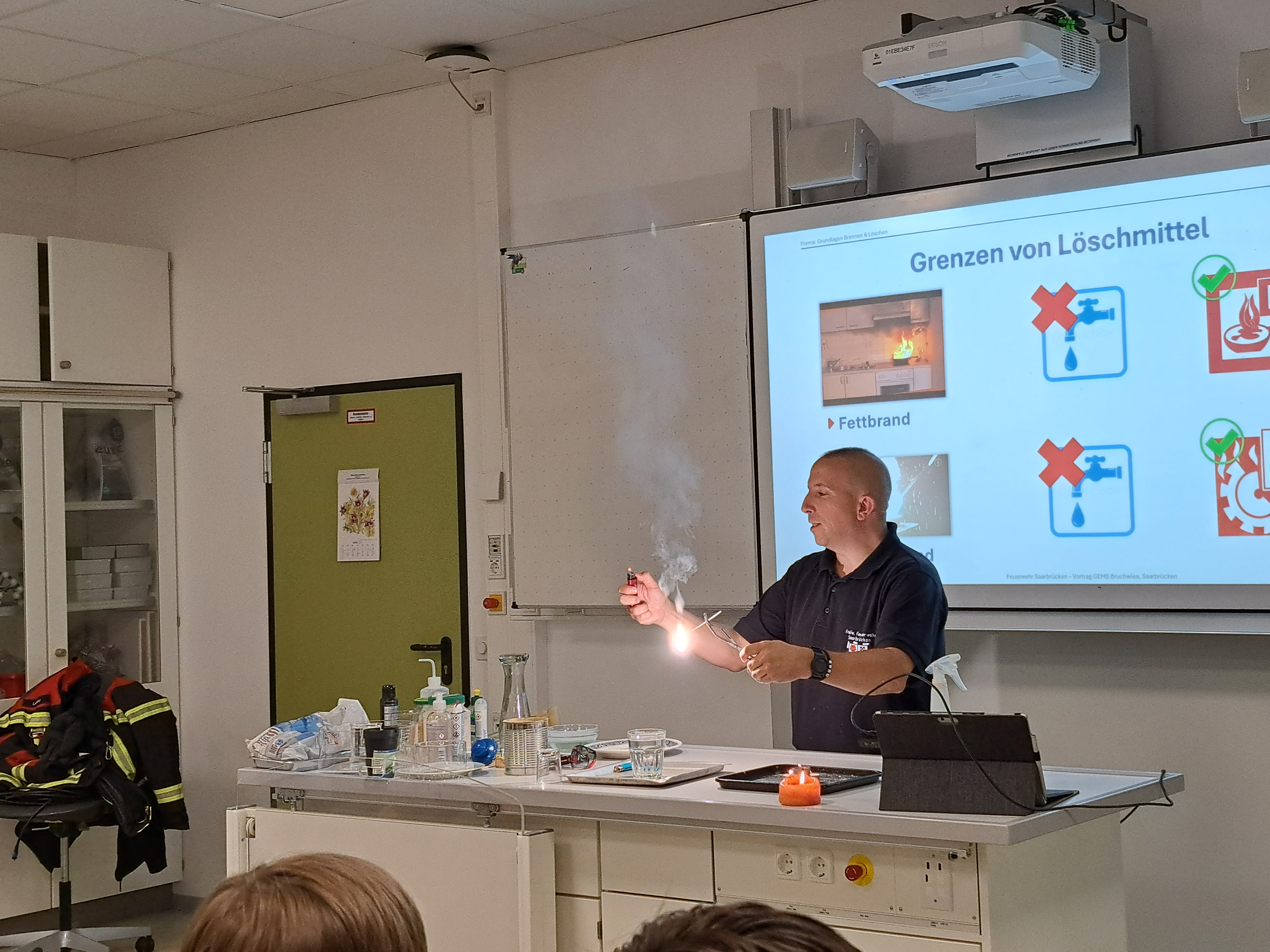 Mit viel Getöse, Stichflammen und kleinen Explosionen endete für die Schüler:innen des bundesweit einzigartigen und neuen Blaulicht-Schulfachs das theoretische Unterrichtsmodul „Brennen & Löschen“ im Chemiesaal unserer Schule. Während der Unterrichtsstoff zu den Theoriebausteinen „Feuer“, „Verbrennungsdreieck“, „Löschmittel“ und „Brandklassen“ in den letzten beiden Wochen vermittelt wurden, ging es nun im Chemiesaal richtig zur Sache. Zu Gast war die Freiwillige Feuerwehr Saarbrücken, vertreten durch den Löschbezirk 13, Sankt Johann, welche sehr anschaulich und auf die Lebenswirklichkeit der Schüler:innen Bezug nehmend in zahlreichen brandheißen Experimenten den sicheren Umgang mit Feuer schulte und die Gefahren beim Einsatz ungeeigneter Löschmittel demonstrierte.