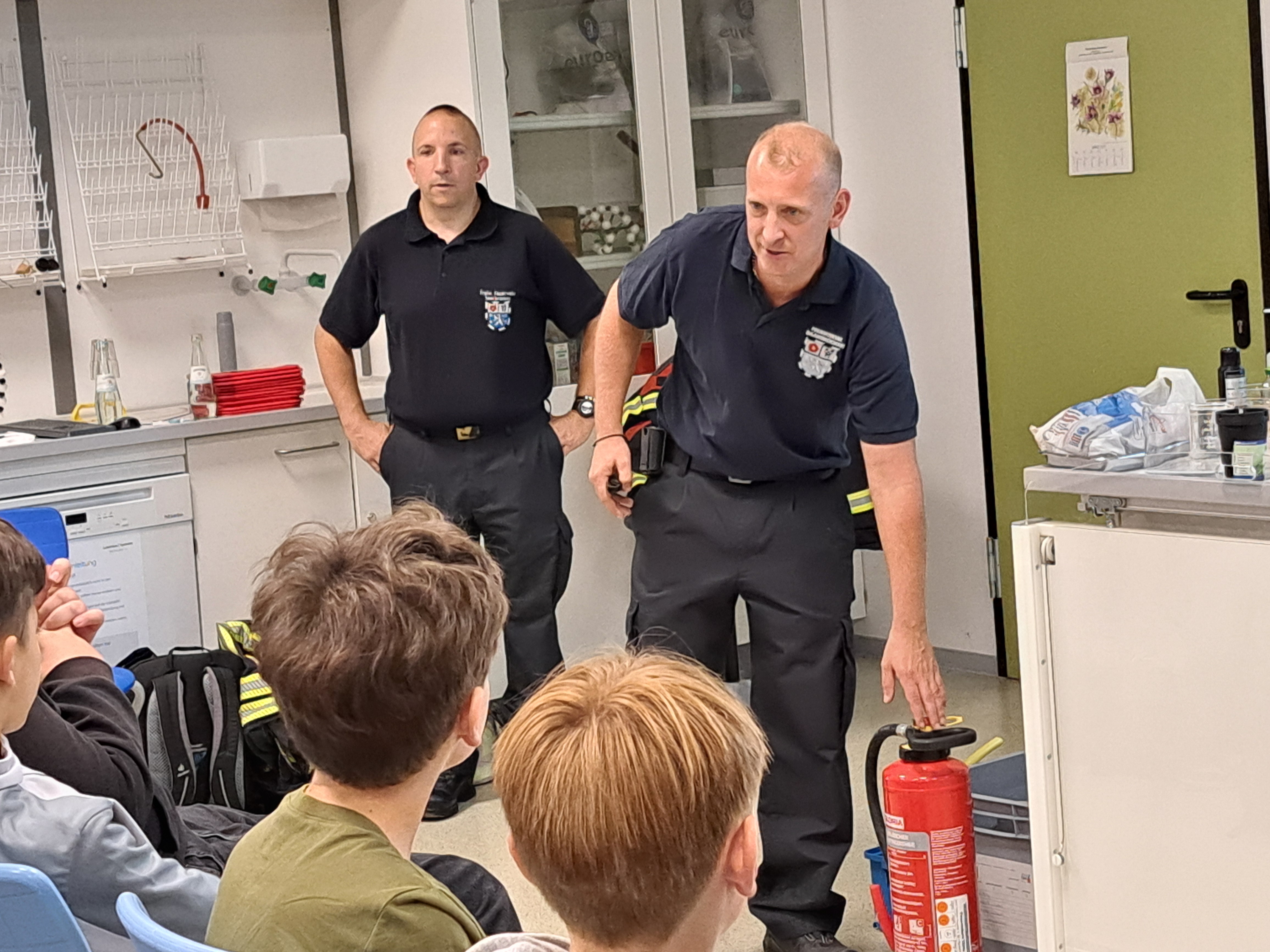 Christian Cazaux (Ausbilder, FF SB, LB13) und Jens Löffler (Löschabschnittsführer, FF Saarbrücken-Mitte) beantworteten geduldig die unzähligen Fragen der jungen und sehr interessierten Zuhörerschaft. Neben dem Casten von spektakulären Feuerbällen aus brennbaren Gasen, gab es auch eine kleine Fettbrandexplosion zu sehen und die Jugendlichen konnten auch die enorme Hitzeentwicklung bei einer Mehlstaubexplosion erfahren. Jens und Christian führten außerdem vor, dass Metallbrände nicht mit Wasser löschbar sind.